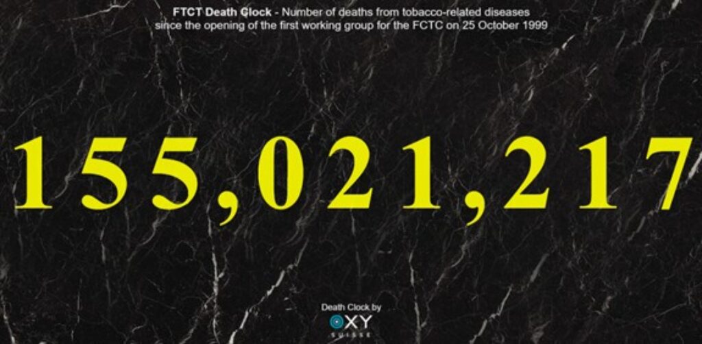 Auf der COP11 der WHO-Rahmenkonvention zur Eindämmung des Tabakkonsums (FCTC) im vergangenen November stellte der Verein OxySuisse die „Death Clock“ oder „Todesuhr“ vor, die die Zahl der Menschen zählt, die seit 1999, dem Beginn der Arbeiten an der FCTC, an durch Tabakkonsum verursachten Krankheiten gestorben sind.